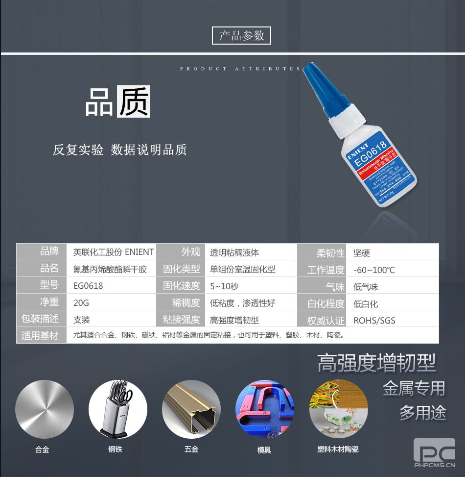 ENIENT EG0618快干膠5~10秒固化金屬專(zhuān)用合金鋼鐵磁鐵鋁材塑料塑膠木材陶瓷透明20G